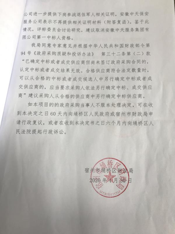 宿州市埇桥区财政局关于《宿州市埇桥区城区学校安保等服务采购项目》投诉处理决定书