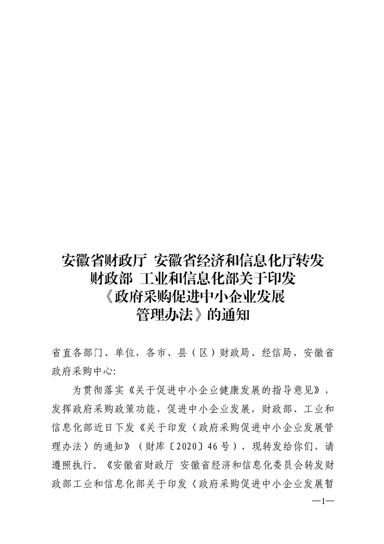 安徽省财政厅安徽省经济和信息化厅转发财政部工业和信息化部关于印发《政府采购促进中小企业发展管理办法》的通知