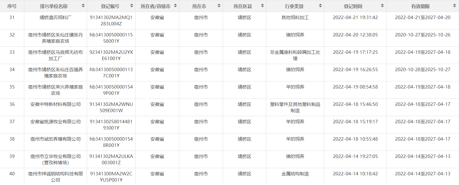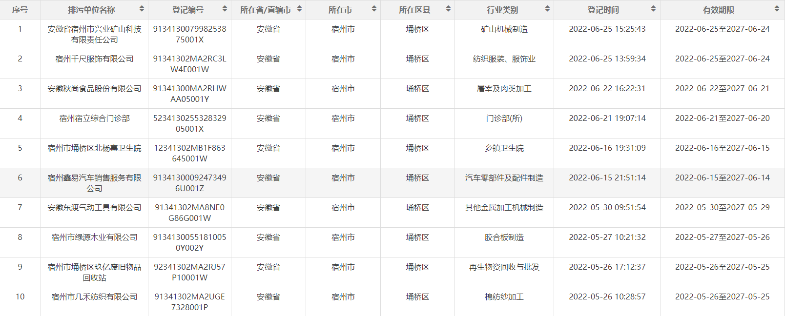 2022年埇桥区生态环境分局第二季度排污名单