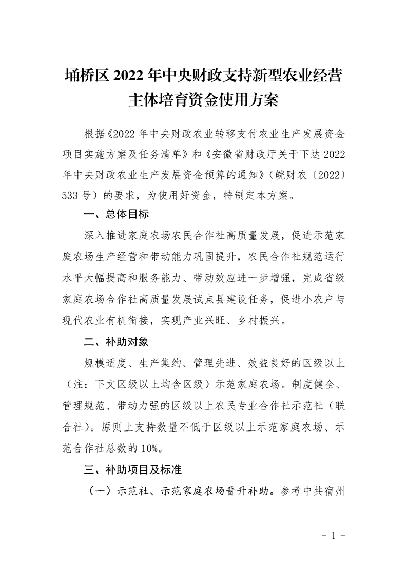 埇桥区2022年中央财政支持新型农业经营主体培育资金使用方案