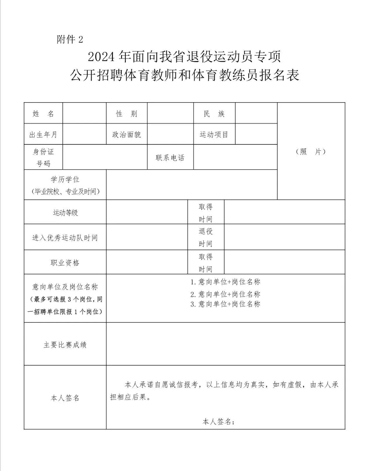 1.《2024年全省大中小学面向我省退役运动员专项公开招聘体育教师和体育教练员报名表》(下载打印并手写签名);
