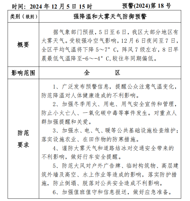 强降温和大雾天气防御预警